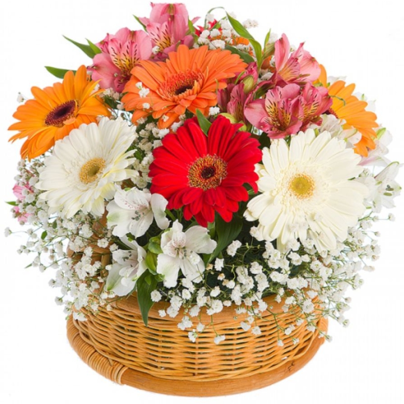 Букет состоит из MIX из 9 гербер, 4 альстромерии, 4 ветки гипсофилы, корзина, оазис.