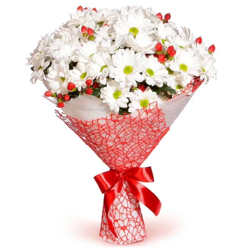 Букет состоит из 7 веток белой хризантемы, 4 гиперикума, красивая упаковка, атласная лента.