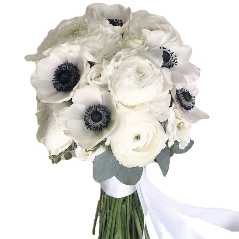 Букет состоит из 7 анемонов, 8 пионов, прозрачная упаковка, атласная лента.