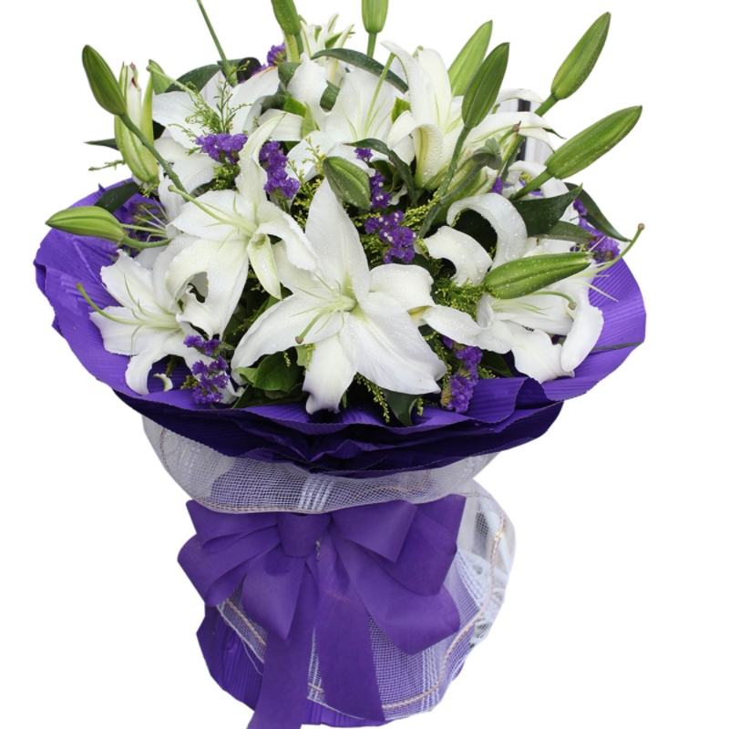Букет состоит из 5 белых лилий, 4 статица, зелень, красивая упаковка, атласная лента.