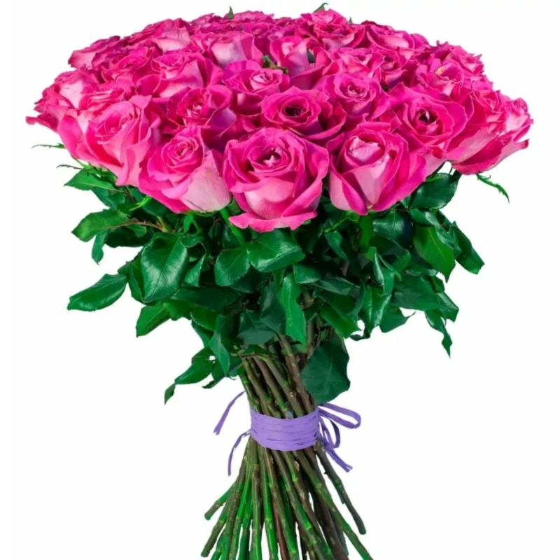 Букет состоит из 31 малиновая роза, прозрачная упаковка, атласная лента.