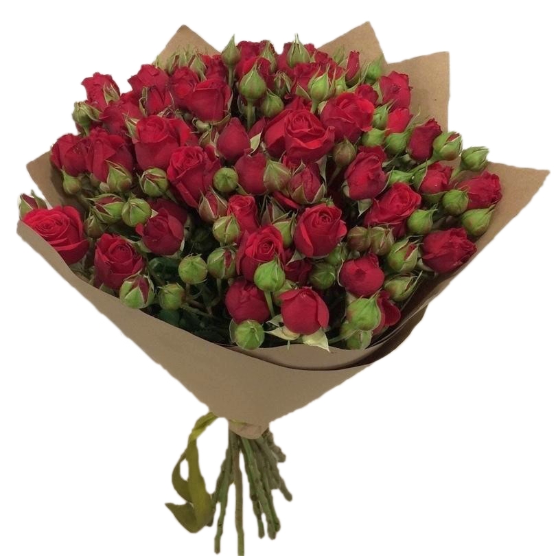 Букет состоит из 11 красных кустовых роз, крафт, атласная лента.
